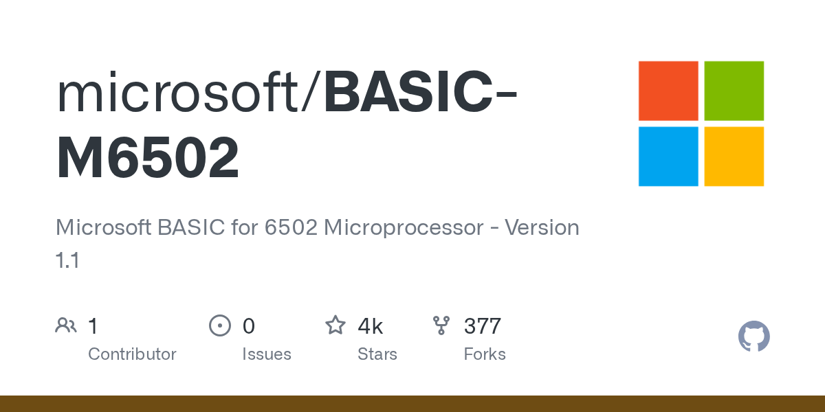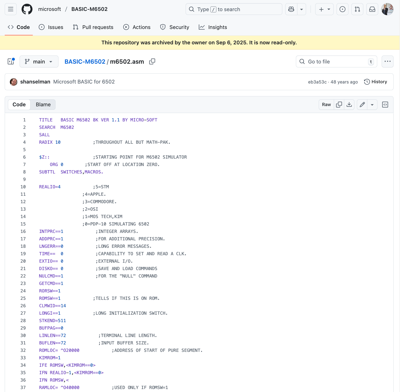 Before this official release of Microsoft 6502 BASIC on github, there were “unofficial” copies, reverse engineered code, preserved archives. But this MIT-licensed version removes uncertainty around legality, makes it safe for hobbyists, educators, historians to use.  Microsoft says build environments have been reconstructed by preservationists; they’ve verified the source can still reproduce byte-exact ROMs. Microsoft and some other long-standing computer software companies have recently started this welcome trend of freely releasing their legacy code for posterity. Microsoft themselves most notably have released the source code for MS-DOS 1.25, 2.0, and 4.0 on GitHub as well as the MS-DOS based GW-BASIC languages as well as the some slightly more modern software such as the File Manager (winfile) from Windows 3.0 and most of the .NET Framework components.